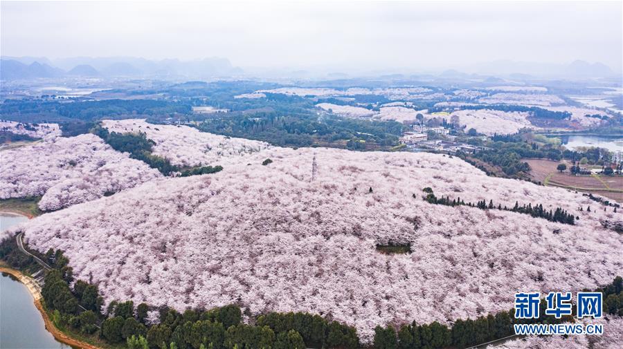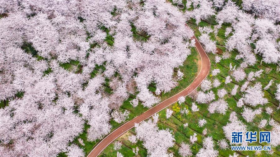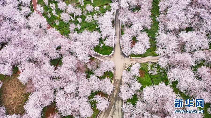 3月12日拍攝的貴安新區(qū)櫻花觀光園風景(無人機照片)。 近日,貴州省貴安新區(qū)櫻花觀光園內櫻花競相盛開,花團錦簇間春意盎然。據介紹,疫情防控期間,為避免人群聚集,櫻花園暫不接待游客。 新華社記者 陶亮 攝