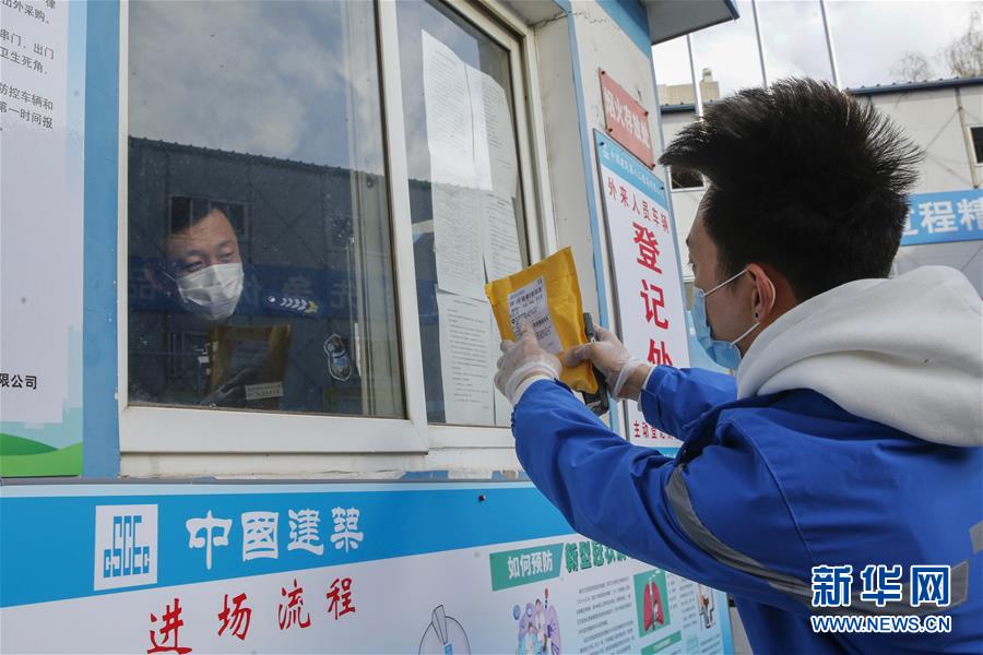 3月12日,李杰(右)在一個投遞點(diǎn)向傳達(dá)室工作人員詢問收件人的信息。新華社記者張玉薇攝