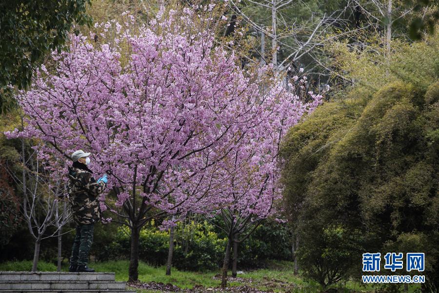 3月3日,一名工作人員在觀賞盛開的櫻花。新華社記者費茂華攝