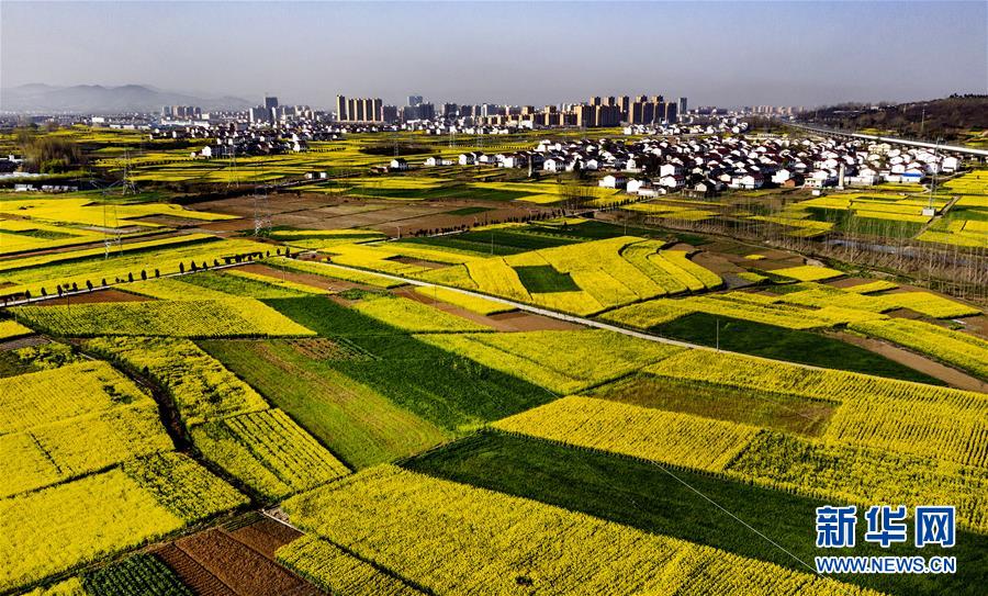3月14日,洋縣龍亭鎮(zhèn)柳山村盛開的油菜花與村舍構(gòu)成美麗的圖畫(無人機照片)。  新華社記者陶明攝