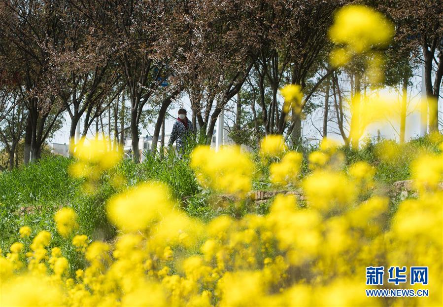 3月14日,在武漢市西北部市郊,一名市民從油菜花田前走過。隨著氣溫升高,春意在武漢的枝頭上萌動,花朵漸次開放。新華社記者肖藝九攝