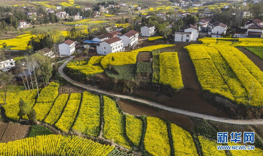 3月14日,洋縣龍亭鎮(zhèn)柳山村盛開的油菜花與村舍構(gòu)成美麗的圖畫(無人機照片)。 新華社記者陶明攝