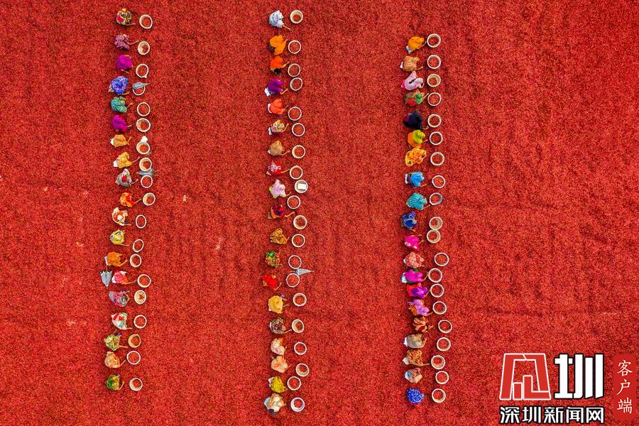 孟加拉國伯格拉,航拍穿著五顏六色衣服的工人們排列整齊的分揀辣椒。