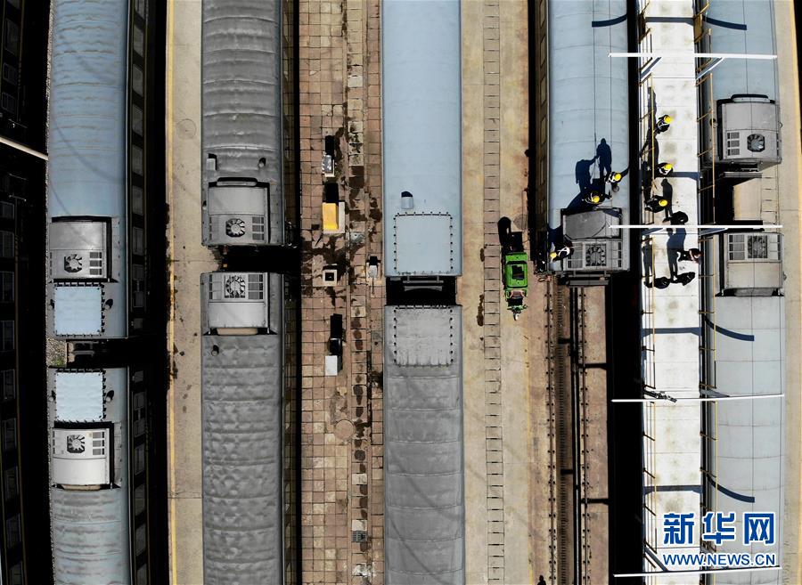 3月19日,鄭州車輛段客車檢車員在登頂平臺(tái)上對(duì)客車空調(diào)機(jī)組進(jìn)行檢修作業(yè)(無(wú)人機(jī)照片)。新華社記者 李安 攝