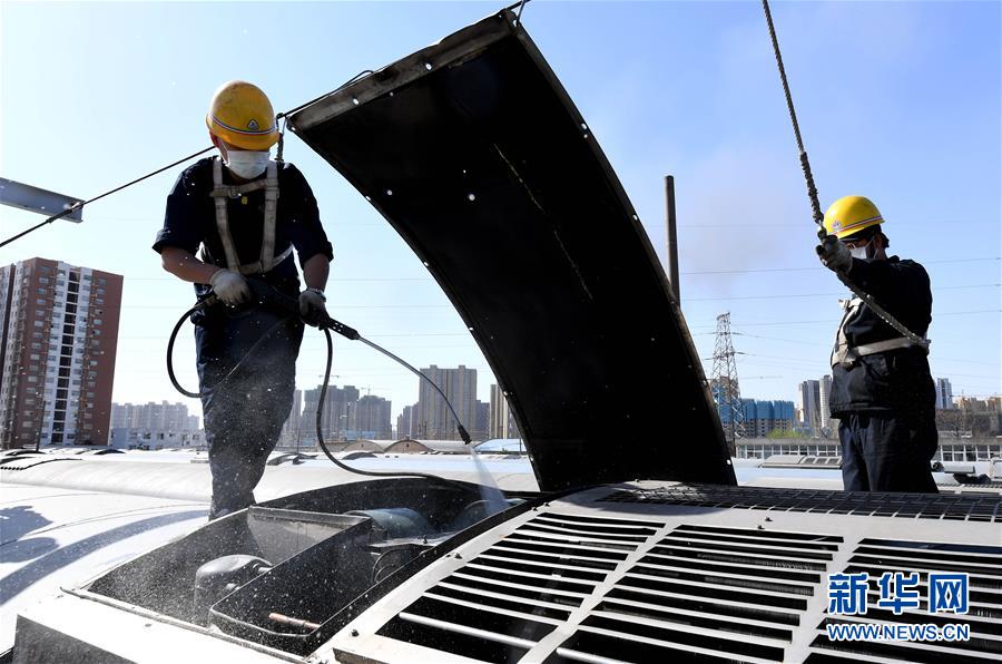 3月19日,鄭州車輛段客車檢車員在對客車空調機組蒸發(fā)器、壓縮機等內部設備進行清洗。新華社記者 李安 攝
