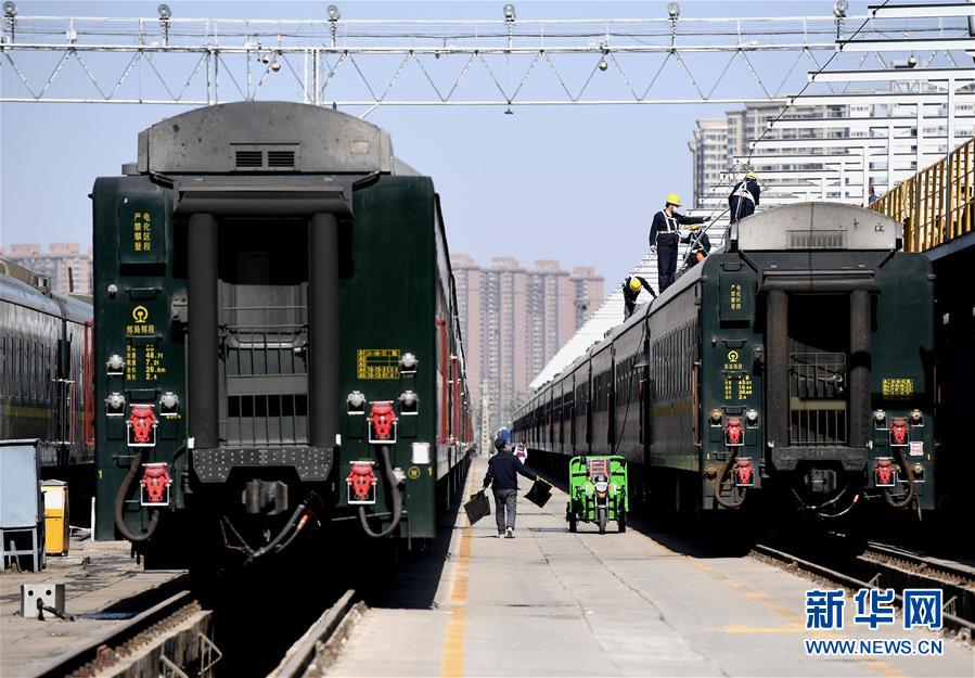 3月19日,鄭州車輛段客車檢車員在對客車空調(diào)機(jī)組進(jìn)行檢修作業(yè)。新華社記者 李安 攝