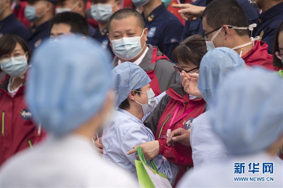 3月21日,武漢市第一醫(yī)院的護士長杜沛(中左一)與天津市醫(yī)療隊隊員道別。杜沛是負責(zé)與天津市醫(yī)療隊對接的護士長。新華社記者費茂華攝