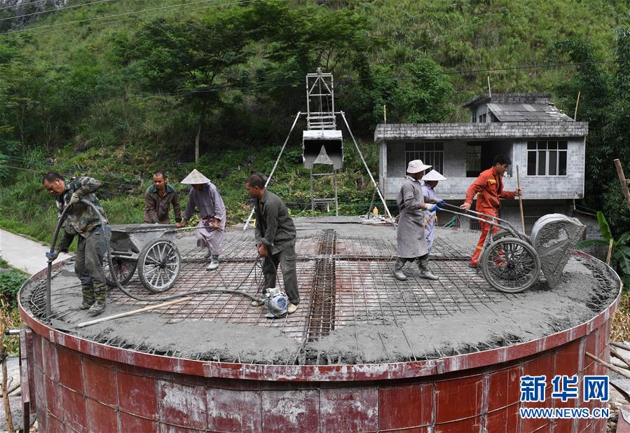 在廣西大化瑤族自治縣板升鄉(xiāng)弄勇村,群眾在修建家庭水柜(2017年9月2日攝)。廣西有近一半貧困人口生活在石漠化地區(qū),涉及數(shù)十個縣區(qū)。這里也是廣西飲水保障程度最低的地區(qū),解決貧困人口飲水問題是廣西脫貧攻堅戰(zhàn)“硬仗中的硬仗”?!笆濉币詠?,廣西加快實施農(nóng)村飲水安全鞏固提升工程。因地制宜,采取新建、擴建及管網(wǎng)延伸等多種措施,補齊貧困地區(qū)水利薄弱短板,進一步提升石漠化地區(qū)群眾飲水安全保障水平,助推脫貧攻堅。新華社記者黃孝邦攝