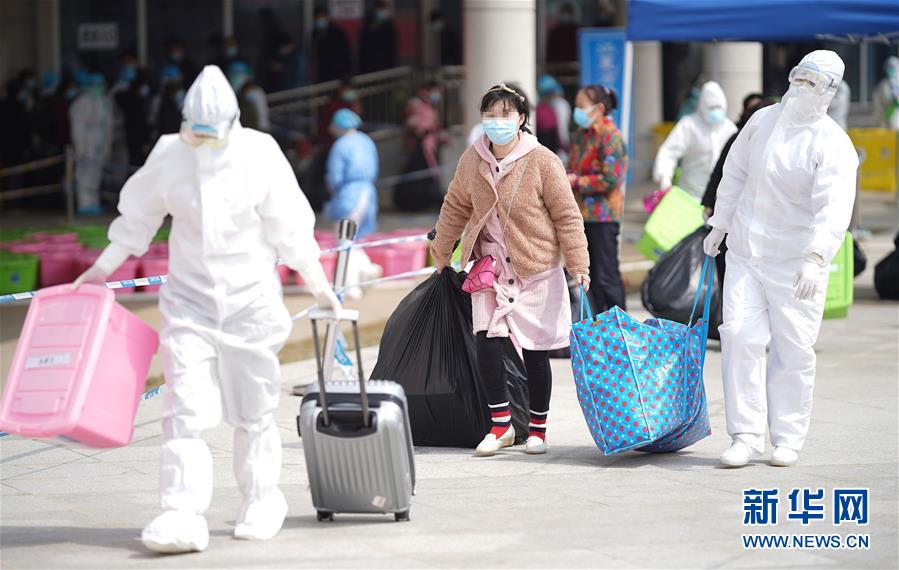 3月10日,在武漢江夏方艙醫(yī)院,醫(yī)護(hù)人員幫助新冠肺炎治愈患者(中)拿行李。新華社記者才揚(yáng)攝