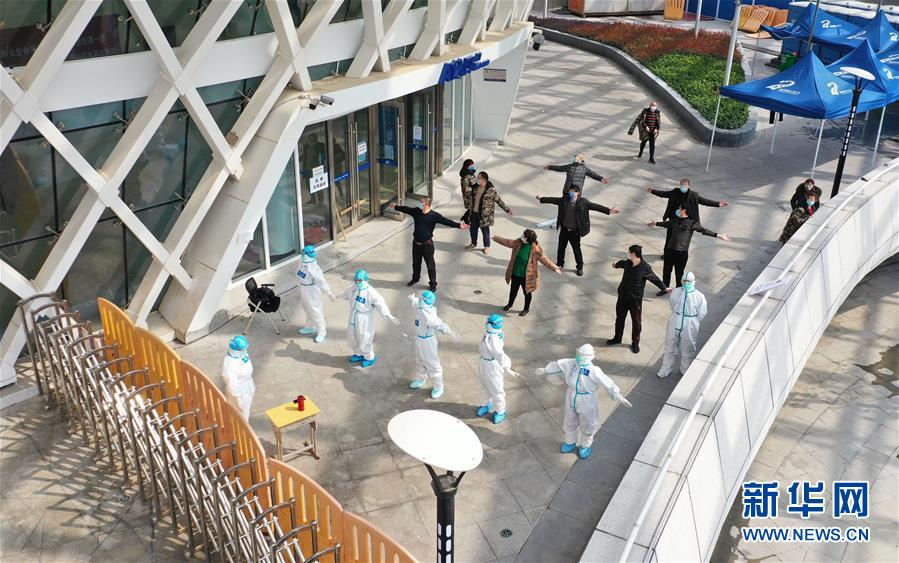 3月10日,在武漢江夏方艙醫(yī)院,醫(yī)護(hù)人員教患者練習(xí)八段錦(無(wú)人機(jī)照片)。新華社記者才揚(yáng)攝