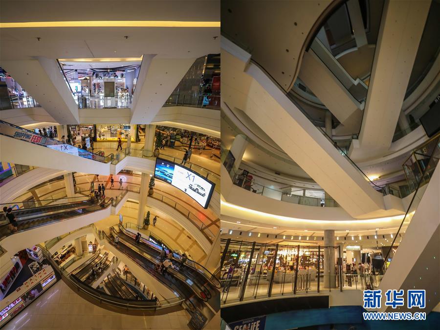 這是3月21日拍攝的泰國(guó)曼谷暹羅百麗宮商場(chǎng)(上圖)和3月22日拍攝的停止?fàn)I業(yè)的商場(chǎng)的對(duì)比圖。新華社記者張可任攝