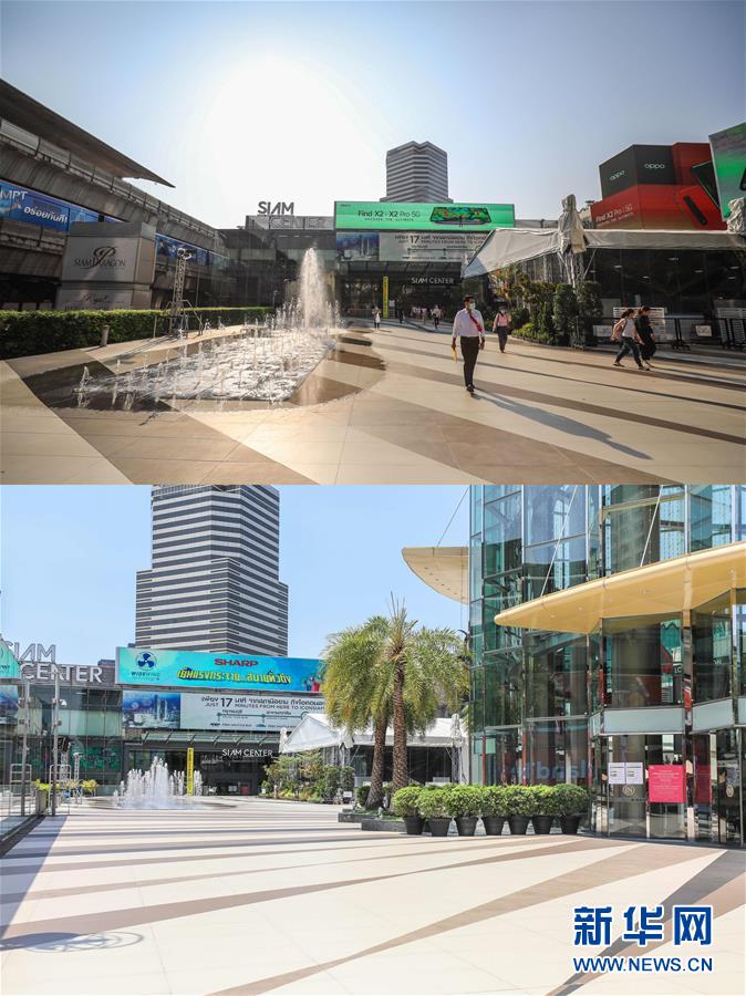 這是3月21日拍攝的泰國(guó)曼谷暹羅廣場(chǎng)(上圖)和3月22日拍攝的空無(wú)一人的廣場(chǎng)的對(duì)比圖。新華社記者張可任攝