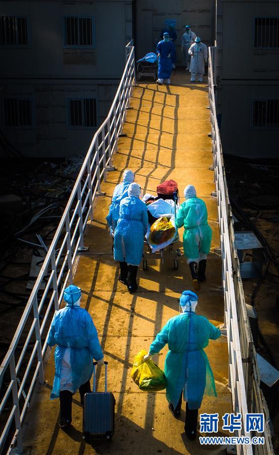 醫(yī)護(hù)人員將患者轉(zhuǎn)運(yùn)至武漢火神山醫(yī)院病房(2月4日攝,無(wú)人機(jī)照片)。新華社記者肖藝九攝