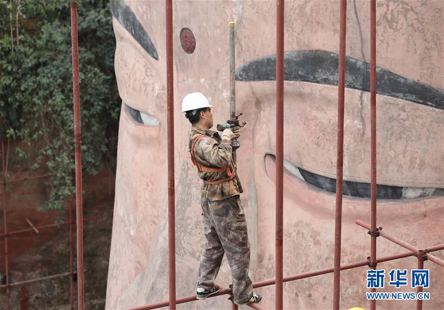 12月10日前后已逐步遮蔽大佛頭部,對(duì)頭面部進(jìn)行勘測;12月底將開始拆除頭部腳手架,保證2019年元旦節(jié)之前,先露出佛頭,供游客觀賞。