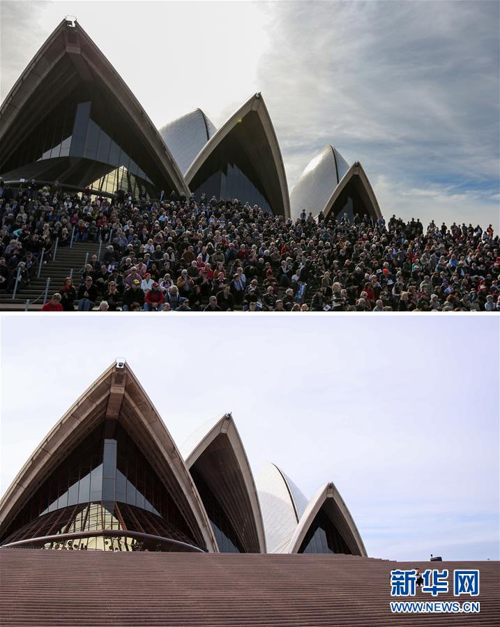 拼版照片顯示:(上)2019年6月14日,大量市民坐在澳大利亞悉尼歌劇院前的臺階上。(下)2020年3月24日,澳大利亞悉尼歌劇院前的臺階上空空蕩蕩。澳大利亞從當?shù)貢r間3月23日中午起,關閉影院、室內(nèi)體育館、健身房等文體娛樂場所,飯店和咖啡館只允許外賣業(yè)務。 新華社記者 白雪飛 攝