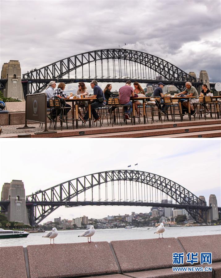 拼版照片顯示:(上)3月10日,澳大利亞悉尼環(huán)形碼頭的餐廳顧客滿(mǎn)座。(下)3月24日,澳大利亞悉尼環(huán)形碼頭的餐廳已關(guān)閉。 新華社記者 白雪飛 攝