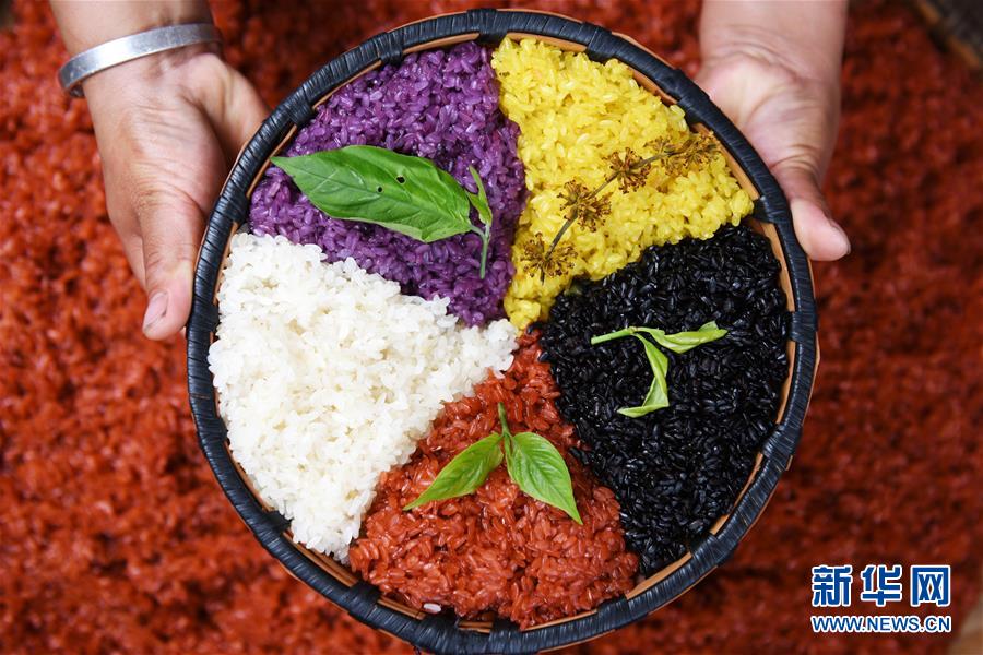 每年農(nóng)歷三月十五前后,貴州省黔東南苗族侗族自治州臺(tái)江縣苗族同胞有制作“姊妹飯”、喜迎姊妹節(jié)的習(xí)俗。“姊妹飯”是使用不同植物的樹(shù)葉或花朵碾壓成汁液作為原色,對(duì)糯米進(jìn)行浸泡并蒸熟的五彩糯米飯。姊妹節(jié)期間,青年男子可以向心儀的姑娘討要“姊妹飯”,姑娘們則通過(guò)贈(zèng)送藏有不同物品的“姊妹飯”傳情達(dá)意。