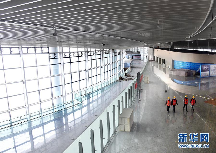 3月25日,幾名工人從建設(shè)中的青島膠東國際機場航站樓出發(fā)大廳走過。新華社記者李紫恒攝