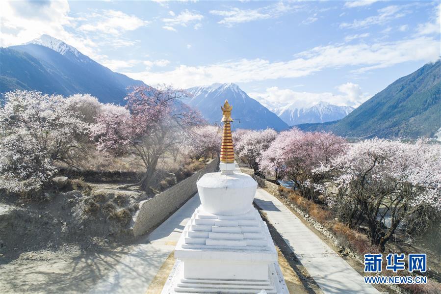 西藏林芝市波密縣境內(nèi)桃花盛開(kāi)的田園風(fēng)光(無(wú)人機(jī)照片,3月26日攝)。新華社記者 普布扎西 攝