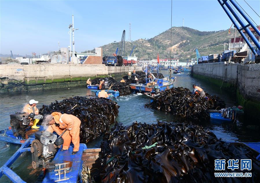 大欽島鄉(xiāng)東村碼頭擠滿了正在卸載的收割船(5月24日攝)。新華社記者朱崢攝