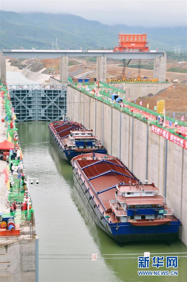 3月31日,船只??吭诖筇賺{水利樞紐工程船閘閘室。新華社記者崔博文攝