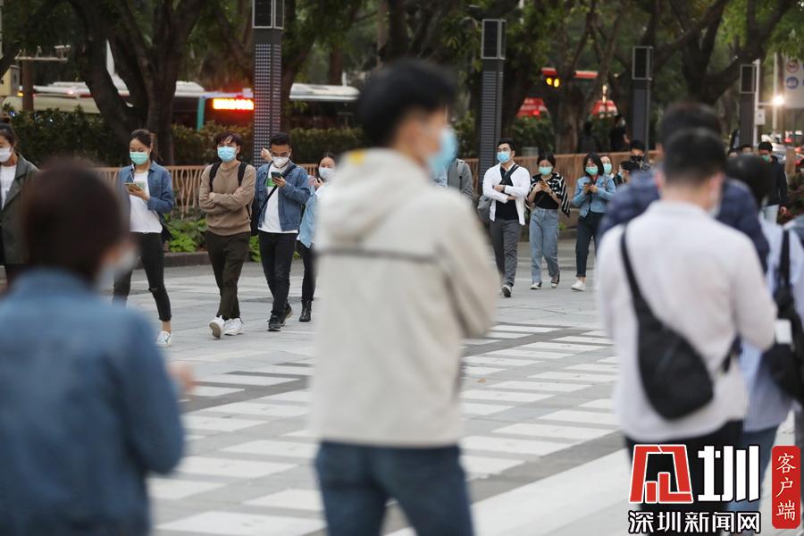 見圳客戶端·深圳新聞網(wǎng)2020年3月19日訊 下班時間,深圳地鐵一號線深大站A3出口外,下班后的市民在站外排大排長龍,依次有序進入地鐵站乘坐列車回家。