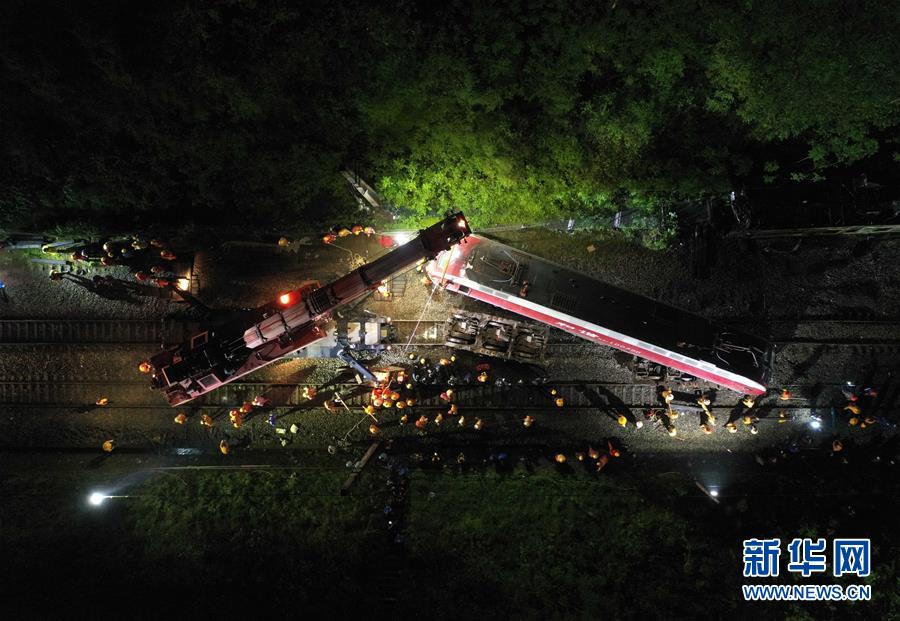 3月30日晚,工程機(jī)械在京廣鐵路郴州段脫軌事故現(xiàn)場(chǎng)作業(yè)。新華社記者李尕?cái)z