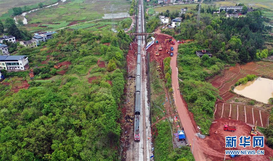 4月1日,Z201次旅客列車通過(guò)京廣鐵路郴州段脫軌事故區(qū)段(無(wú)人機(jī)照片)。新華社記者李尕?cái)z