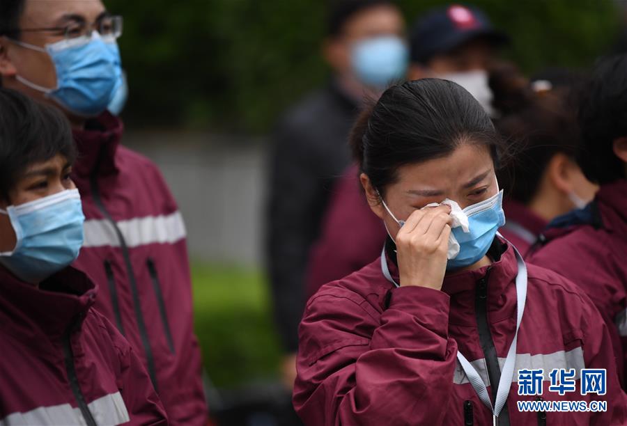 4月3日,來自西安交通大學第一附屬醫(yī)院的醫(yī)療隊隊員王沙沙(前)在送別“戰(zhàn)友”后落淚。 當日,陜西省第一批援鄂醫(yī)療隊137名隊員在陜西省工人療養(yǎng)院結(jié)束了為期兩周的隔離休養(yǎng)。醫(yī)療隊員與“戰(zhàn)友”深情作別后,陸續(xù)踏上歸途。 新華社記者 李一博 攝