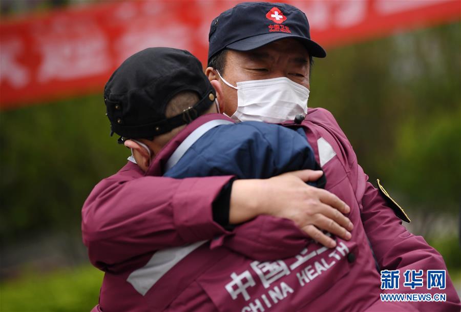 4月3日,陜西省第一批援鄂醫(yī)療隊(duì)隊(duì)長(zhǎng)易智(右)和隊(duì)員擁抱作別。 當(dāng)日,陜西省第一批援鄂醫(yī)療隊(duì)137名隊(duì)員在陜西省工人療養(yǎng)院結(jié)束了為期兩周的隔離休養(yǎng)。醫(yī)療隊(duì)員與“戰(zhàn)友”深情作別后,陸續(xù)踏上歸途。 新華社記者 李一博 攝