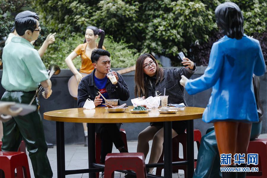 4月5日,人們在武漢市吉慶街的“大排檔”雕塑旁吃熱干面。新華社記者沈伯韓攝