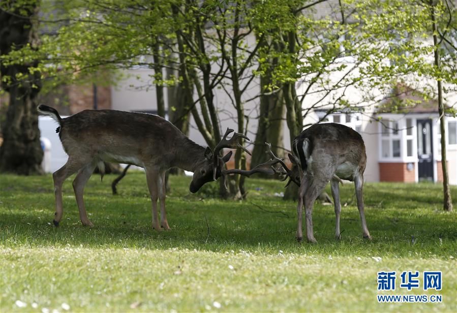 4月8日,在英國倫敦東部一個(gè)居民區(qū),附近公園里的鹿在草坪上吃草。隨著新冠疫情在英國的擴(kuò)散,政府要求人們減少不必要的外出。倫敦東部一個(gè)居民區(qū)附近公園里原來散養(yǎng)的鹿紛紛從公園走出來,或吃草或接受附近居民的喂食,成為特殊時(shí)期居民區(qū)里的新“客人”。新華社記者韓巖攝