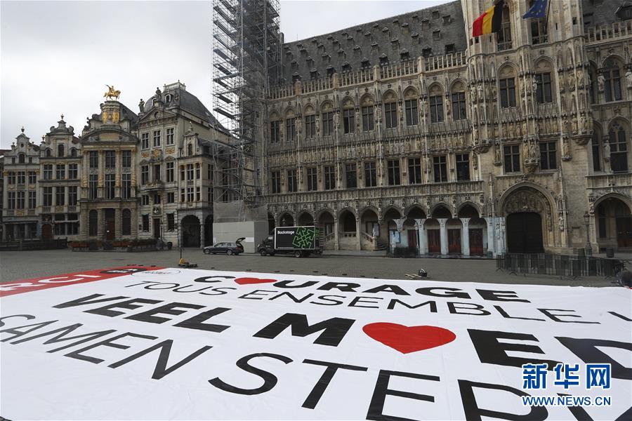 這是4月13日在比利時(shí)布魯塞爾大廣場(chǎng)拍攝的為抗擊疫情加油的巨幅海報(bào)。當(dāng)日,比利時(shí)布魯塞爾市政府工作人員在市中心的大廣場(chǎng)展開一面巨幅海報(bào),上面用法語(yǔ)和荷蘭語(yǔ)印著“一起鼓起勇氣”“謝謝”,以感謝市民及醫(yī)療人員為抗擊疫情所做的努力。新華社記者鄭煥松攝