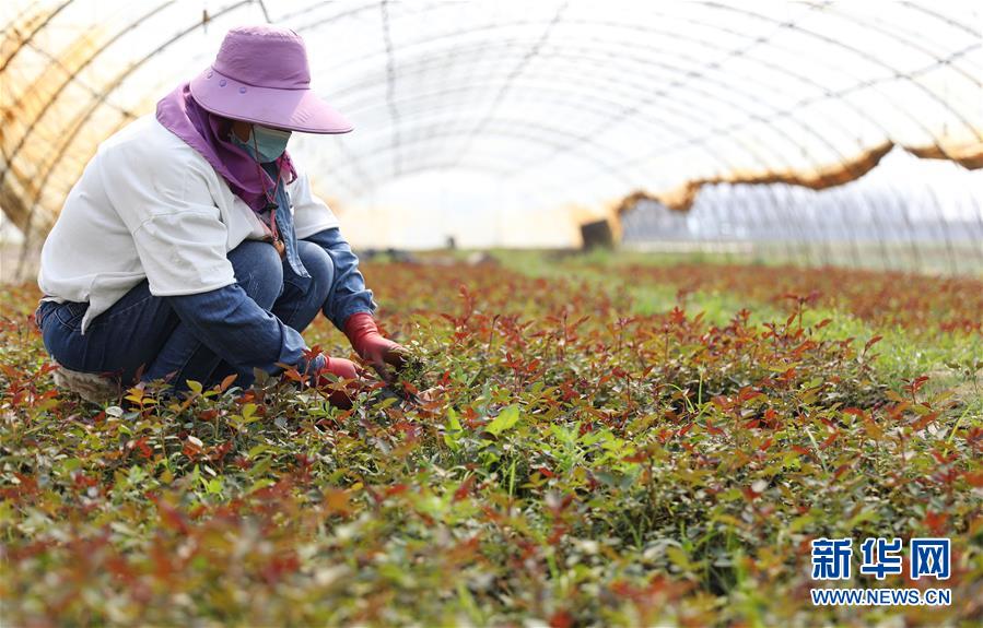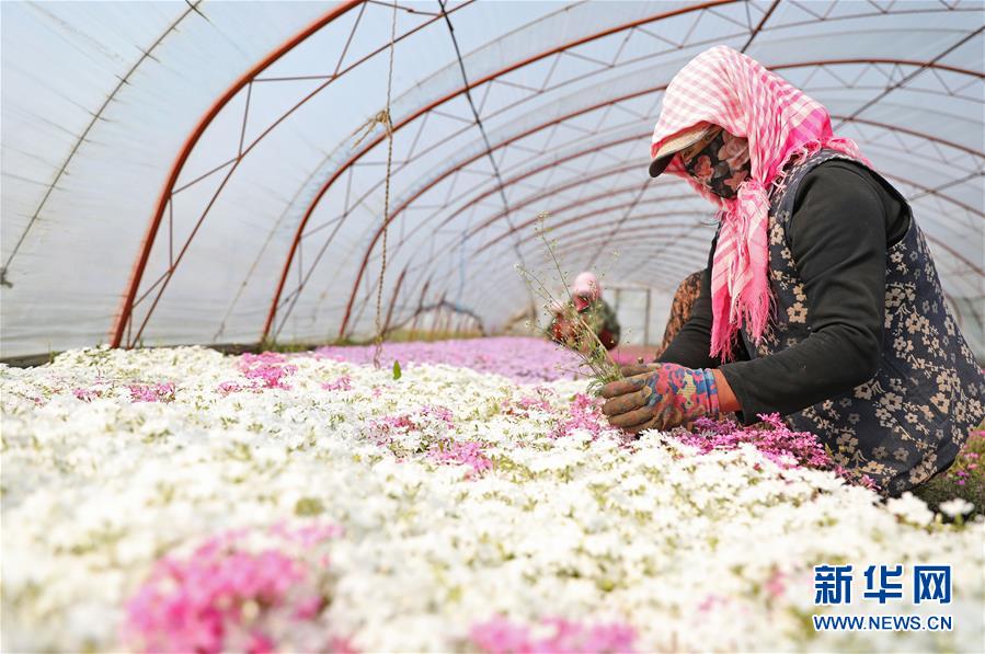 4月13日,花農(nóng)在八角臺街道雅化村一塊花圃內(nèi)分揀培育好的花苗。新華社記者姚劍鋒攝