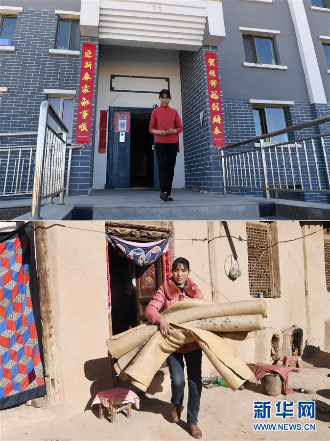 拼版照片:上圖為胥存在古浪縣綠洲生態(tài)移民小城鎮(zhèn)走出家中單元門(mén)(3月10日攝);下圖為胥存在古浪縣黃羊川鎮(zhèn)石城村的家中抱著物品向大門(mén)走去(2018年2月6日攝)。新華社記者范培珅攝