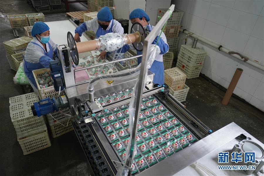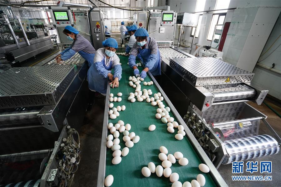 江蘇高郵鴨集團(tuán)的工作人員將塑封好的鴨蛋產(chǎn)品進(jìn)行進(jìn)一步加工作業(yè)(4月15日攝)?!案哙]鴨蛋”是江蘇高郵的特色農(nóng)業(yè)名片。近年來,當(dāng)?shù)卦诹挤N繁育、生態(tài)養(yǎng)殖、產(chǎn)品加工等方面加大力度,推動高郵鴨蛋品牌化建設(shè),讓小鴨蛋成為帶動農(nóng)戶致富的大產(chǎn)業(yè)。2019年,高郵市共計生產(chǎn)熟制鴨蛋產(chǎn)品近11.2億枚,年產(chǎn)值近17.68億元。新華社記者李博攝