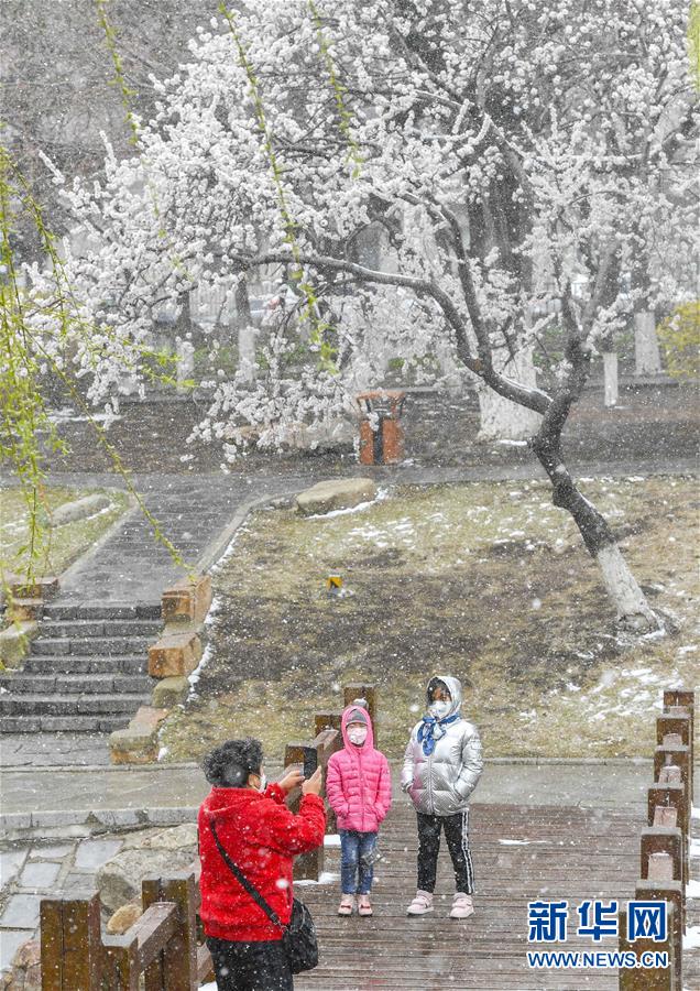 4月21日,在長(zhǎng)春市杏花村公園,市民在雪中拍照留念。當(dāng)日,吉林省多地迎來(lái)降雪天氣。新華社記者許暢攝