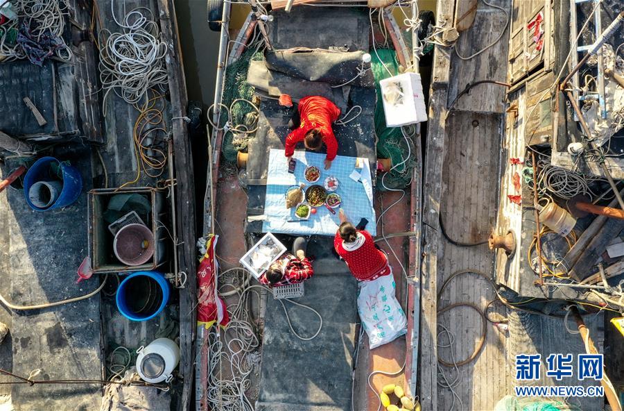 4月22日,馬花雨(下右)、徐紅紅(上)、陸倩(下左)在漁船上拍攝推銷海產(chǎn)品的短視頻。近年來,江蘇省連云港市贛榆區(qū)海頭鎮(zhèn)越來越多的居民開始直播銷售海產(chǎn)品,當?shù)貪O船、碼頭和市場上活躍著一批網(wǎng)絡(luò)直播好手。目前,全鎮(zhèn)有3000多戶商家從事海產(chǎn)品直播銷售業(yè)務(wù),形成了集捕撈、加工、包裝、銷售和物流于一體的電商產(chǎn)業(yè)鏈。新華社記者楊磊攝