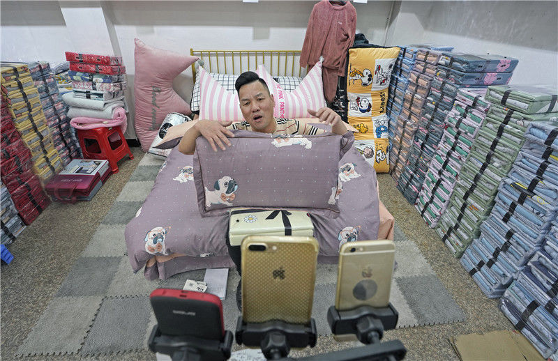 2019年11月11日,浙江金華,義烏北下朱村,在一家床上用品銷(xiāo)售商店,一名男子正在直播。這個(gè)網(wǎng)名叫“點(diǎn)子大哥”的男子姓劉,49歲,來(lái)自杭州農(nóng)村,有三年半的直播經(jīng)歷。