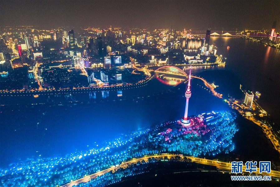 這是4月7日晚在武漢龜山拍攝的夜景(無(wú)人機(jī)照片)。新華社記者肖藝九攝