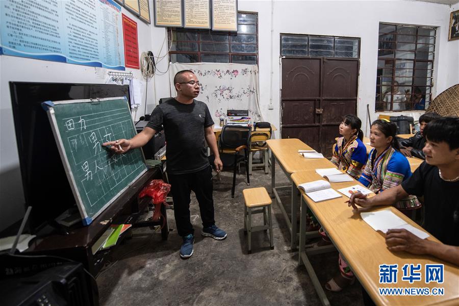 4月10日,在云南省勐??h布朗山鄉(xiāng)曼囡村曼班三隊,娜四在村里上夜校。新華社記者胡超攝
