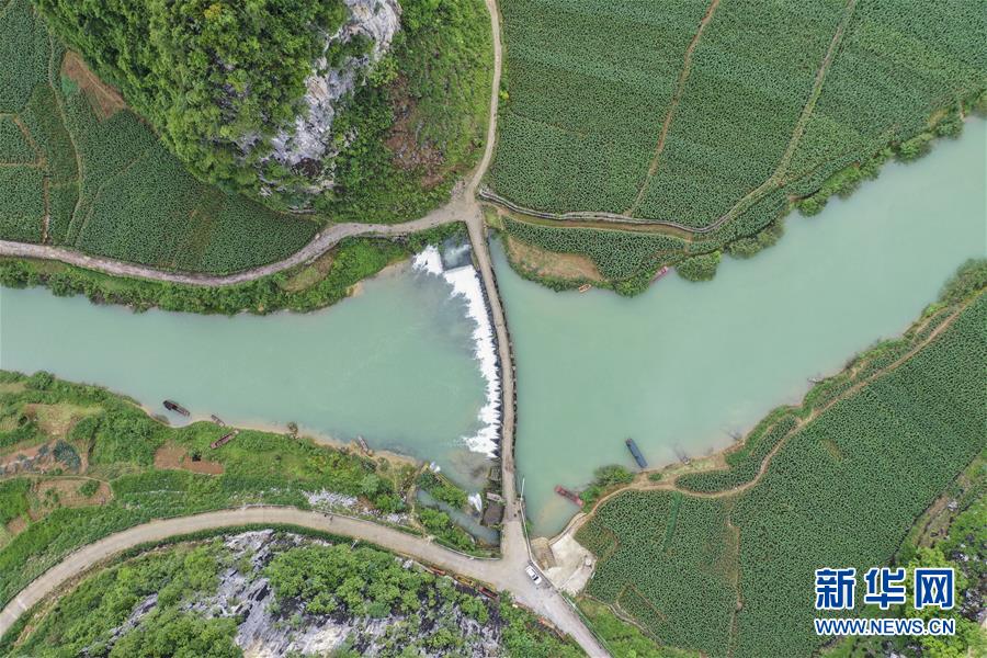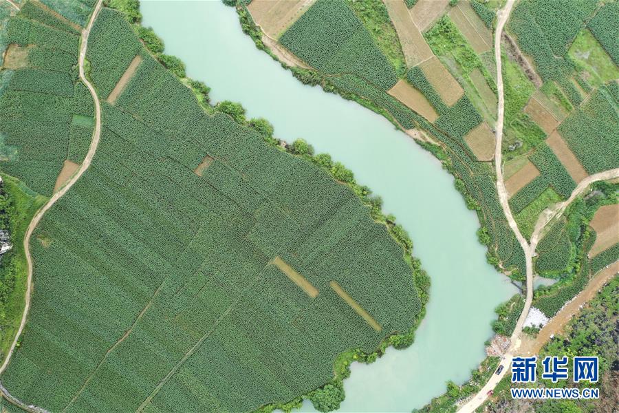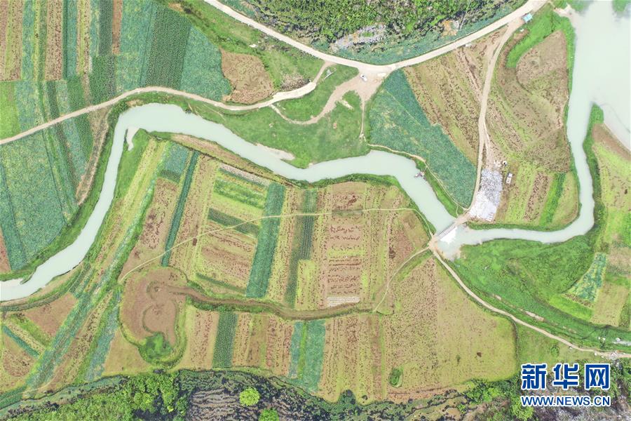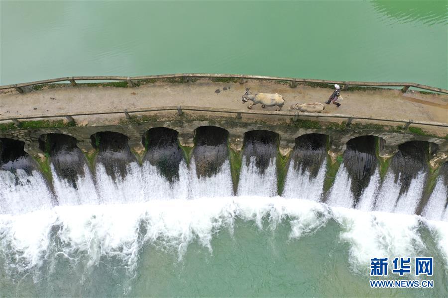 4月23日,在廣西隆安縣南圩鎮(zhèn),農人趕著牲畜走過一座小橋(無人機照片)。新華社記者周華攝