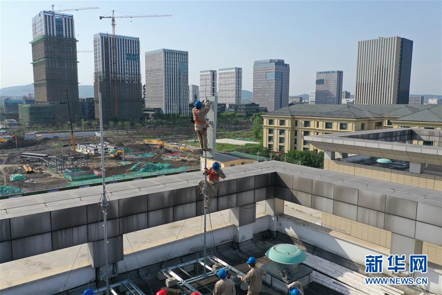 4月25日,在南京220千伏城南河變電站屋頂,工人在架設(shè)設(shè)備(無人機(jī)照片)。當(dāng)日,三大通信運(yùn)營商的2座5G、3座4G基站建設(shè)工作在南京220千伏城南河變電站屋頂有序展開。在變電站內(nèi)建設(shè)基站可有效利用電網(wǎng)資源,縮短建設(shè)周期,節(jié)約建設(shè)成本。新華社記者季春鵬攝
