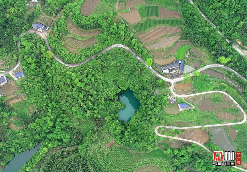 2020年4月24日,在湖南張家界市永定區(qū)“百里畫廊”茅巖河景區(qū)拍攝的“天坑心湖”。(無人機拍攝)
