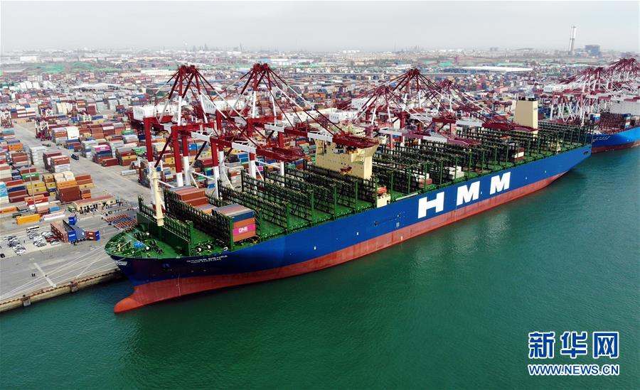 “現(xiàn)代商船阿爾赫西拉斯”輪靠泊在青島港前灣碼頭(無人機(jī)照片,4月26日攝)。當(dāng)日,載箱量可達(dá)2.4萬標(biāo)準(zhǔn)箱的世界最大集裝箱船“現(xiàn)代商船阿爾赫西拉斯”輪從山東青島港開啟首航,這條船的甲板面積超過2.4萬平方米,相當(dāng)于3.5個(gè)標(biāo)準(zhǔn)足球場大小。新華社記者李紫恒攝