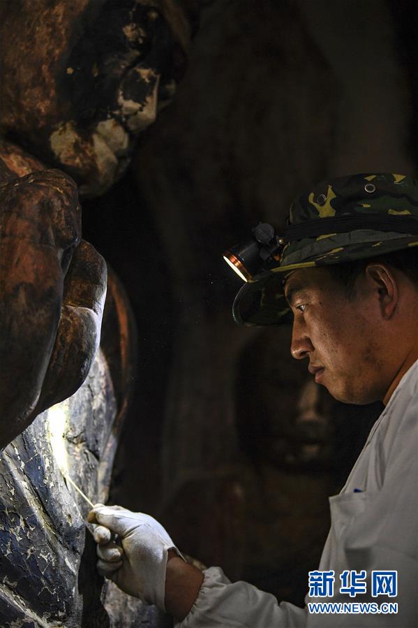 4月27日,文物修復(fù)專家在寧夏須彌山石窟圓光寺48號窟內(nèi)開展修復(fù)工作。新華社記者馮開華攝