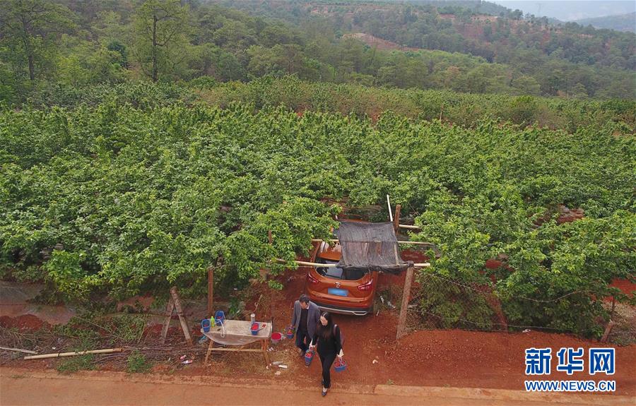 4月28日,游客從云南省富民縣赤鷲鎮(zhèn)普橋村櫻桃園走出(無人機照片)。云南省富民縣赤鷲鎮(zhèn)大力發(fā)展特色種植業(yè),全鎮(zhèn)種植櫻桃4000余畝,幫助當?shù)剞r(nóng)民增收致富。新華社記者楊宗友攝