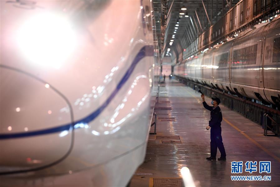 4月29日夜,合肥南動車運用所的工作人員對動車組進行檢修。每當夜深人靜的時候,合肥南動車運用所卻燈火通明,“動車安全守護者”們堅守崗位,對動車組進行全面細致檢修。新華社記者 劉軍喜 攝