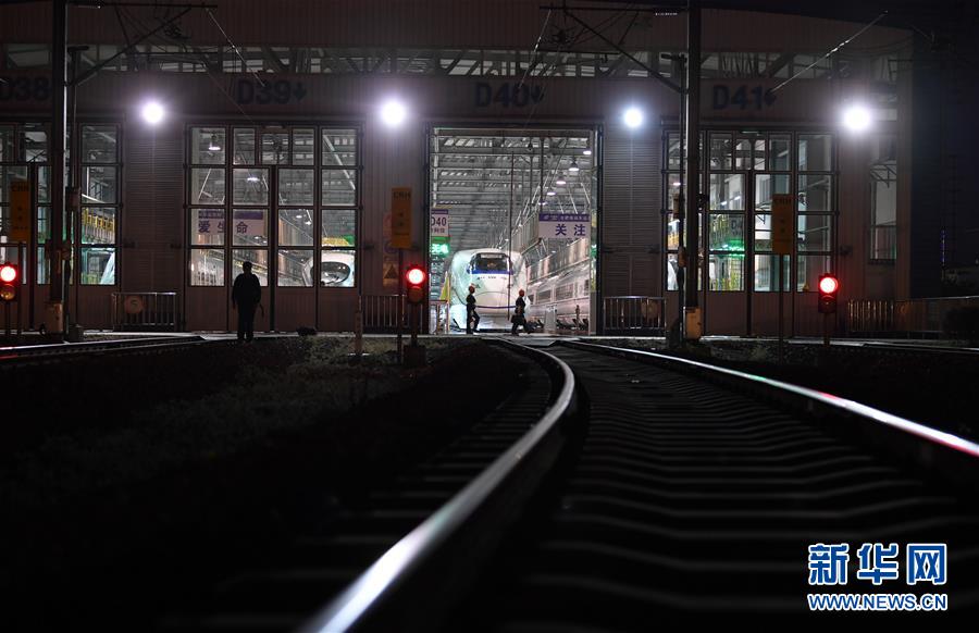 4月29日夜,工作人員行走在合肥南動(dòng)車運(yùn)用所檢修車間內(nèi)。每當(dāng)夜深人靜的時(shí)候,合肥南動(dòng)車運(yùn)用所卻燈火通明,“動(dòng)車安全守護(hù)者”們堅(jiān)守崗位,對動(dòng)車組進(jìn)行全面細(xì)致檢修。新華社記者 劉軍喜 攝