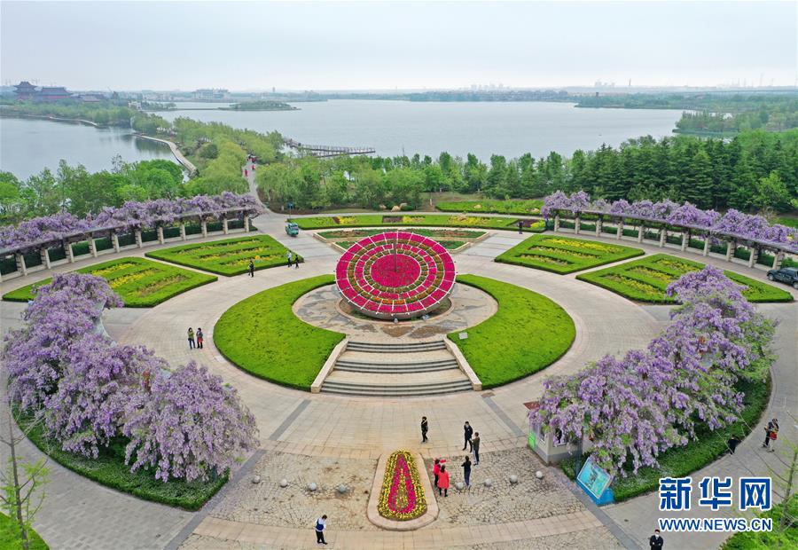 5月2日,游人在位于山東青島膠州市的青島大沽河省級生態(tài)旅游度假區(qū)賞花游玩(無人機照片)?!拔逡弧奔偃掌陂g,人們以多種方式放松心情、享受假日。新華社發(fā)(王昭脈攝)